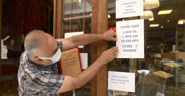 Diyarbakır’da aşıya olan rağbet her geçen gün artarken, esnaf da vatandaşları aşıya teşvik etmek için, ürünlerde indirim yapacağına ilişkin dükkanın girişine duyuru astı. Sur ilçesinde 40 yıldır kuruyemiş dükkanını işleten İbrahim Yalaz, iş yerinin camına ‘1 ve 2 doz aşı olanlarla yüzde 5 indirim’ duyurusu asarak vatandaşları aşıya teşvik ediyor.