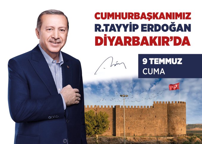 Cumhurbaşkanı Recep Tayyip Erdoğan'ın 9 Temmuz Cuma günü Diyarbakır'a gideceği açıklandı. Cumhurbaşkanlığı Özel Kalem Müdürü Hasan Doğan, sosyal medya hesabından yaptığı paylaşımda "#CumhurbaşkanıErdoğan Cuma Günü #Diyarbakırlılar ile buluşuyor..." diye yazdı.