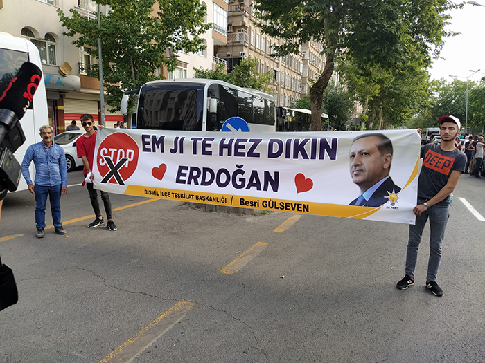 New York'taki Times Meydanı'nda terör örgütü FETÖ’nün yayınlattırdığı ‘Stop Erdoğan’ yazılı aşağılık kampanyaya karşı Diyarbakır Bismil İlçe Teşkilatı sessiz kalmadı. Terör örgütü FETÖ’ye, AK Parti Bismil İlçe Teşkilat Başkanı Besri Gülseven, Cumhurbaşkanı Recep Tayyip Erdoğan’ın Diyarbakır ziyaretinde Kürtçe pankartla cevap verdi. Destek pankartında Kürtçe, ‘Em Ji Te hez dıkım’ ‘Seni seviyoruz Erdoğan’ anlamına gelen dev pankart açıldı.