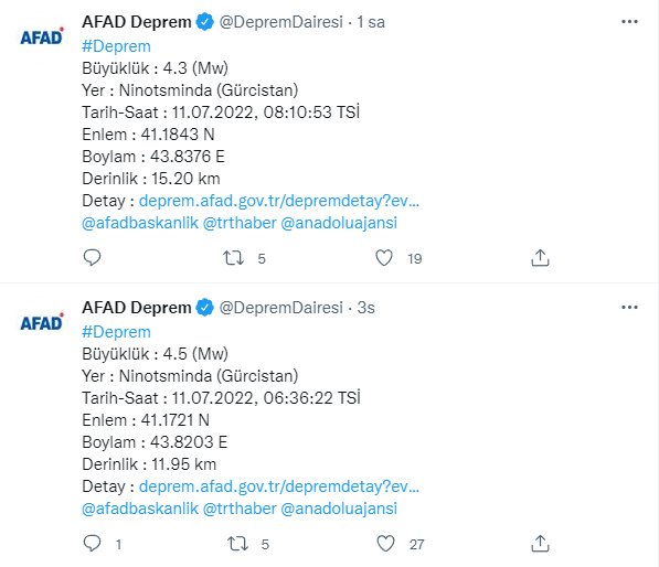 AFAD 'ın internet sitesinde yer alan bilgilere göre Gürcistan saat 06.36'da 4.5 büyüklüğündeki depremle sarsıldı. Ülkede saat 08.10'da 4.3 büyüklüğünde bir deprem daha meydana geldi.