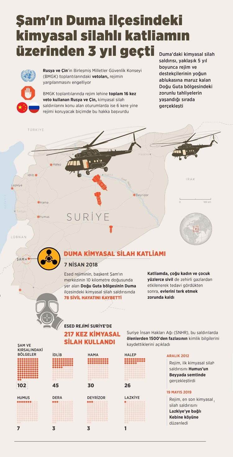 Suriye'de Beşşar Esed rejiminin başkent Şam'ın Doğu Guta bölgesindeki Duma ilçesine 7 Nisan 2018'de kimyasal silahla 78 sivili öldürdüğü katliamın üzerinden 3 yıl geçti.