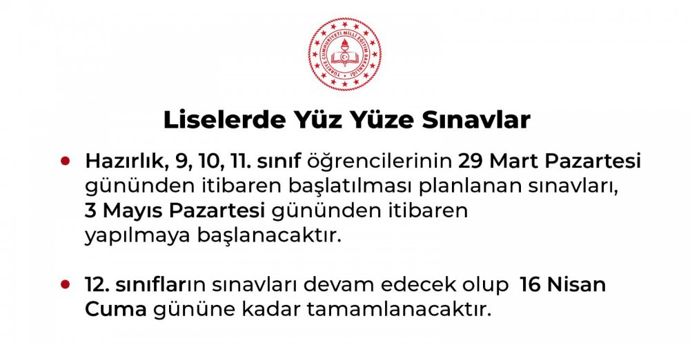 (İHA) - Milli Eğitim Bakanlığı, 9, 10 ve 11. sınıf öğrencilerinin 29 Mart’ta başlayacak yüz yüze sınavlarının 3 Mayıs'a ertelendiğini duyurdu. Milli Eğitim Bakanlığı liselerde yapılacak yüz yüze sınavlar hakkında yazılı bir açıklama yaptı. Açıklamada, "Hazırlık, 9, 10, 11. sınıf öğrencilerinin 29 Mart Pazartesi gününden itibaren başlatılması planlanan sınavları, 3 Mayıs Pazartesi gününden itibaren yapılmaya başlanacaktır. 12. sınıfların sınavları devam edecek olup 16 Nisan Cuma gününe kadar tamamlanacaktır” denildi.