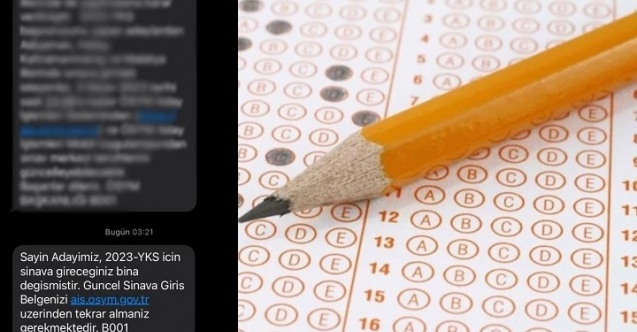 ÖSYM Başkanlığı tarafından YKS’ye girecek adaylara gönderilen kısa mesajda (SMS), “Sayın Adayımız, 2023-YKS için sınava gireceğiniz bina değişmiştir. Güncel Sınava Giriş Belgenizi ais.osym.gov.tr üzerinden tekrar almanız gerekmektedir” bildirisine yer verildi.