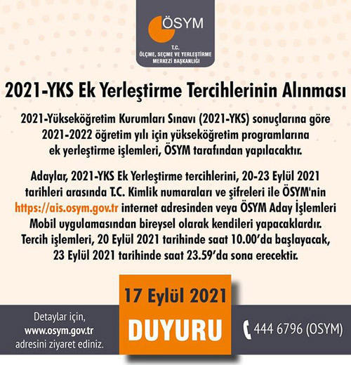 Yükseköğretim programlarının 2021-YKS sonuçlarına göre yapılan genel yerleştirme sonunda boş kalan veya kaydolmama nedeniyle dolmayan kontenjanlarına ÖSYM tarafından merkezî olarak 'ek yerleştirme' yapılacak.
