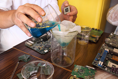 * Bunları yakarak ya da evde kullanılan çamaşır suyu gibi temizlik ürünleriyle eriterek saf altın haline getiriyoruz. En iyi iletken olduğu için bütün elektronik cihazlarda altın, gümüş, paladyum ve bakır kullanılmıştır.