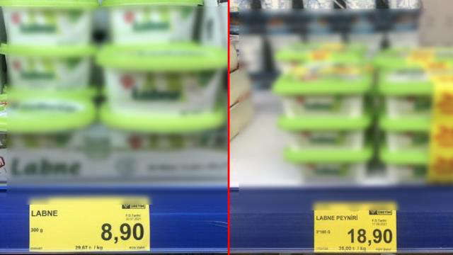 Market zincirinde satışa sunulan 300 gramlık labne peyniri 8.90 TL'den satışa sunulurken, ürünün kilogram fiyatı ise 29.67 lira olarak gösterildi. Ancak aynı marka ürün her biri 180 gram olarak 3'lü olarak satışa sunuldu. Avantajlı paket olarak satılan labnenin fiyatı ise 18.90 olarak belirtildi. Avantajlı olarak satışa sunulan labnenin kilogram fiyatı ise 35 lira oldu. (Haberler.com)