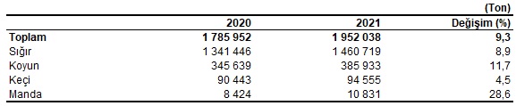 2021 yılı için 1 milyon 952 bin 38 ton olarak tahmin edilen toplam kırmızı et üretiminin %74,8'ini sığır eti, %19,8'ini koyun eti, %4,8'ini keçi eti ve %0,6'sını manda eti oluşturdu.
