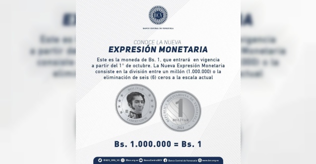 Venezuela Merkez Bankası tarafından yapılan açıklamada, ülkedeki eski para biriminden altı sıfırı kaldırarak, 1 Ekim’de ülkenin yeni dijital parası olan Bolivar Digital’i dolaşıma sürüleceği kaydedildi. Merkez Bankası, dönüşüm sonrasında hiçbir Venezuelalıyı dışlamamak için fiziksel ve dijital Bolivar’ın bir arada var olacağını belirterek, 1 Bolivar’lık madeni para ile 5, 10, 20, 50 ve 100 Bolivar’lık banknotları piyasaya süreceklerini açıkladı. Yeni dönüşüm sonrasında piyasadaki en değerli banknot olan yeni 100 Bolivar, şu anda piyasadaki 100 milyon Bolivar’a ve Venezuela Merkez Bankası’nın 4 Ağustos tarihindeki kapanış döviz kuruna göre 24,77 ABD dolarına eşit olacak.