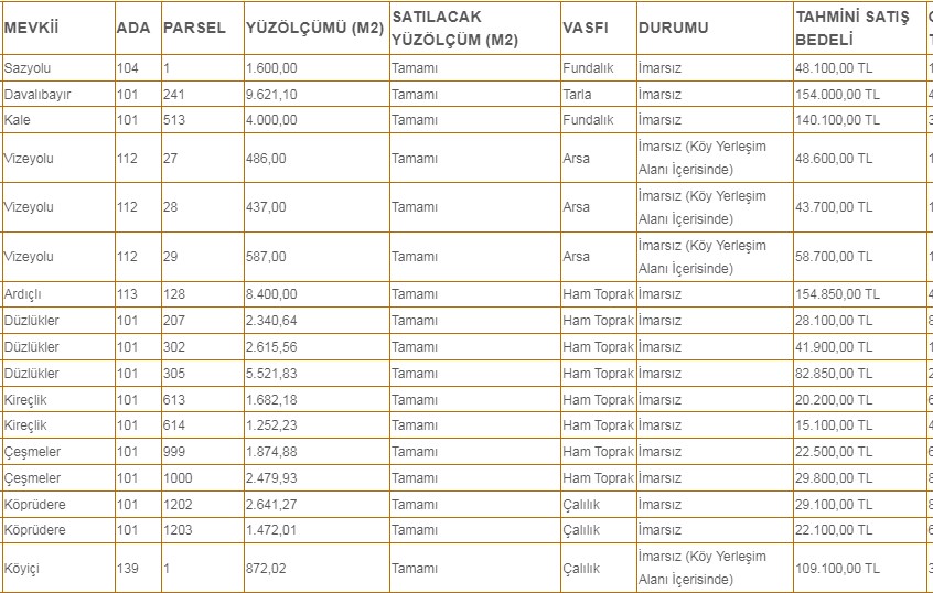 * Kırklareli Vize'de mülkiyeti Hazineye ait 30 adet taşınmaz satılacaktır (arsa, çalılık, fundalık, ham toprak)