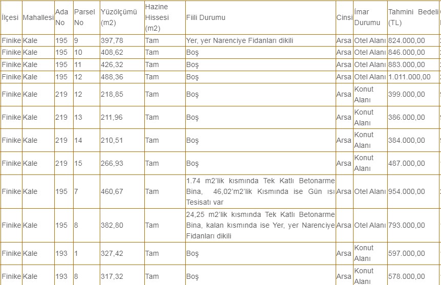 * Finike Milli Emlak Şefliği 16 adet arsa nitelikli taşınmazı satacak.