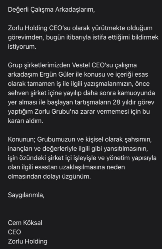 Grup şirketlerimizden Vestel CEO'su çalışma arkadaşım Ergün Güler ile konusu ve içeriği esas olarak tamamen iş ile ilgili yazışmalarımızın, önce sehven şirket içine yayılıp daha sonra kamuoyunda yer alması ile başlayan tartışmaların 28 yıldır görev yaptığım Zorlu Grubu'na zarar vermemesi için bu kararı aldım.