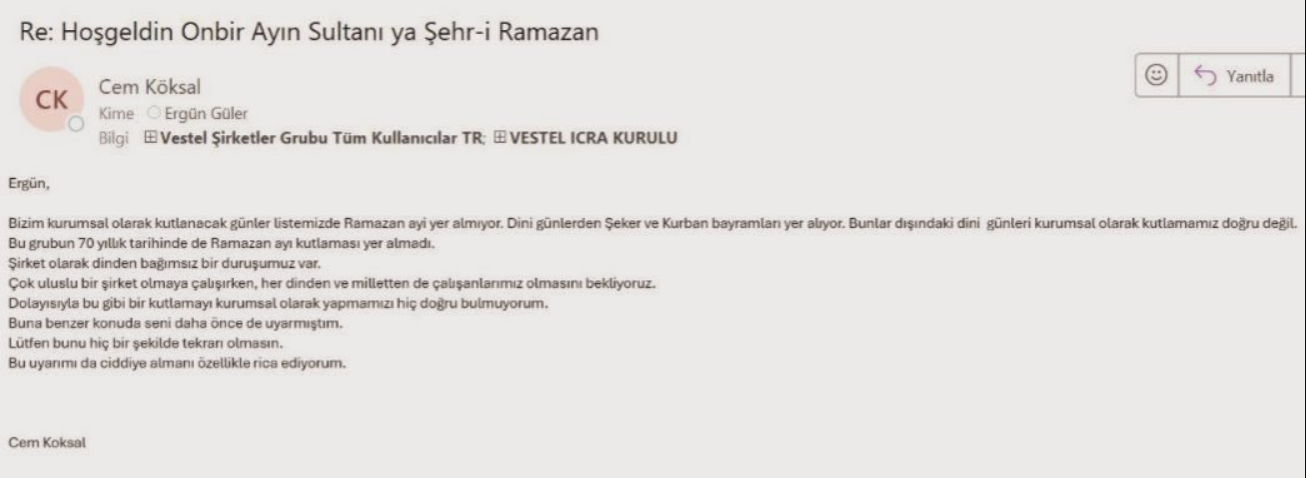 "Bizim kurumsal olarak kutlanacak günler listemizde Ramazan ayı yer almıyor. Dini günlerden Şeker ve Kurban bayramları yer alıyor. Bunlar dışındaki dini günleri kurumsal olarak kutlamamız doğru değil. Bu grubun 70 yıllık tarihinde de Ramazan ayı kutlaması yer almadı. Şirket olarak dinden bağımsız bir duruşumuz var. Çok uluslu bir şirket olmaya çalışırken her dinden ve milletten de çalışanlarımız olmasını bekliyoruz. Buna benzer konuda seni daha önce de uyarmıştım. Lütfen bunu hiçbir şekilde tekrarı olmasın. Bu uyarımı da ciddiye almanı özellikle rica ediyorum."