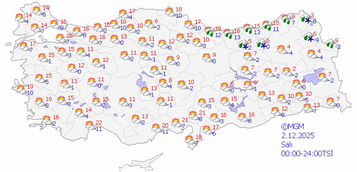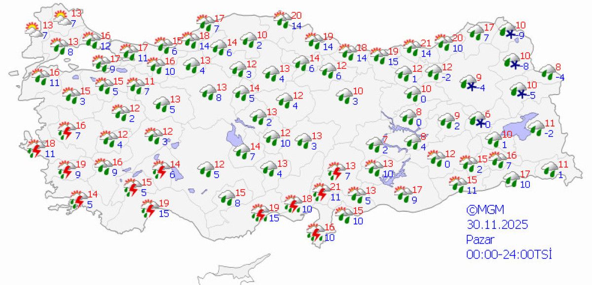 Yağışların Marmara, Ege ve Akdeniz'de gök gürültülü sağanak; İç Anadolu'nun doğusunun yüksekleri, Doğu Karadeniz'in iç kesimlerinin yüksekleri ile Doğu Anadolu'nun kuzey ve doğusunun yükseklerinde karla karışık yağmur ve kar şeklinde; Mersin ve Adana çevreleri ile Hatay kıyılarında yerel kuvvetli olması bekleniyor.