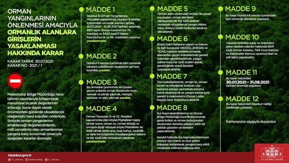 İstanbul Valisi Ali Yerlikaya, yaptığı açıklamada, "30 Temmuz-31 Ağustos tarihleri arasında ormanlara girmek, orman çevresinde ve içinde mola vermek, orman alanlarında piknik yapmak yasaklanmıştır" dedi.