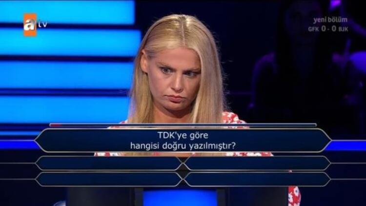 Yarışmacıya "TDK'ye göre hangisi doğru yazılmıştır?" sorusu yöneltildi. Cevap şıkları arasında düşünceye dalan yarışmacı soruda gizli olan cevabı fark edemedi.