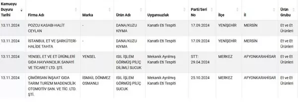 Gıda denetimlerinin sıkılaştırıldığını belirten Bakanlık, her gün yenilenen ifşa listesi ile vatandaşlara güvenilir gıdaya erişim sağlamayı hedefliyor. Listeye eklenen yeni ürünler arasında sucuk, kıyma ve et ürünlerinde yapılan taklit ve tağşişler bulunuyor. Vatandaşların, tükettikleri et ve et ürünlerinde sağlık riski taşımamak adına ifşa listesindeki markaları kontrol etmesi önem taşıyor.