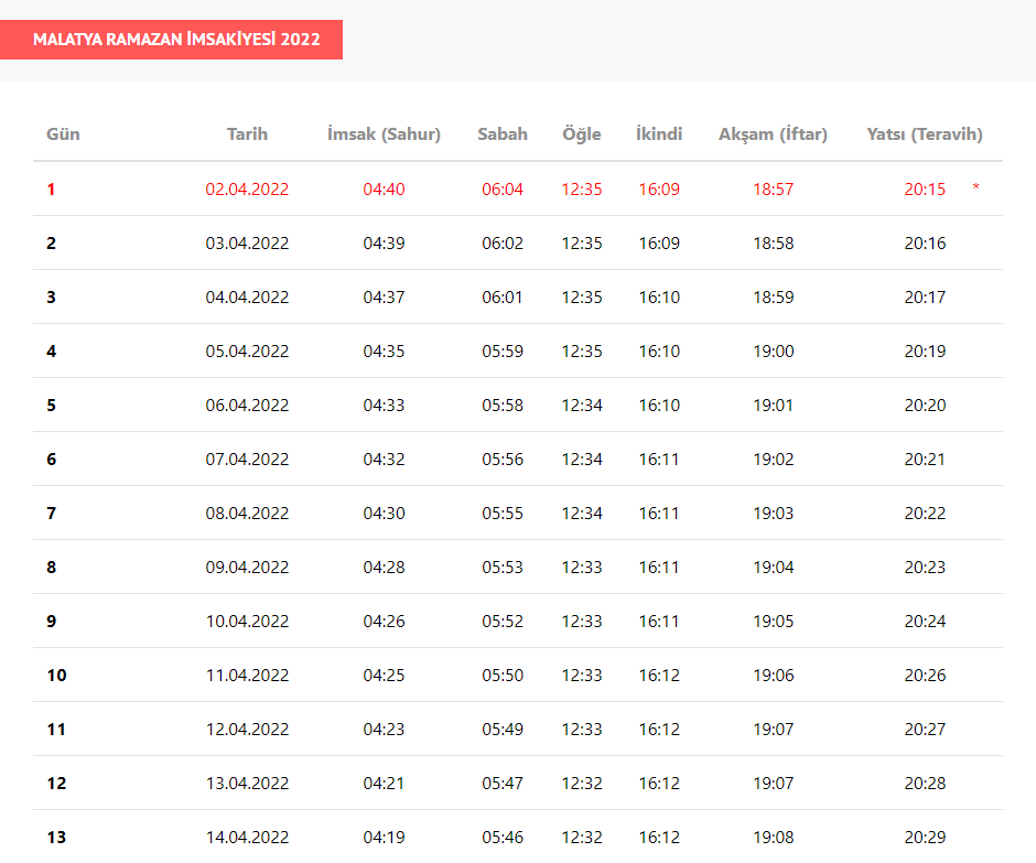 Malatya'da ilk iftar, 2 Nisan'da saat 18.57 sahur ise 04:40'da gerçekleşecek.