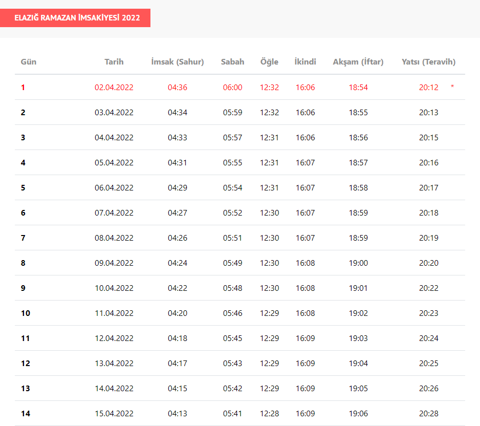 Elazığ'da ilk iftar, 2 Nisan'da saat 18.54 sahur ise 04:36'da gerçekleşecek.