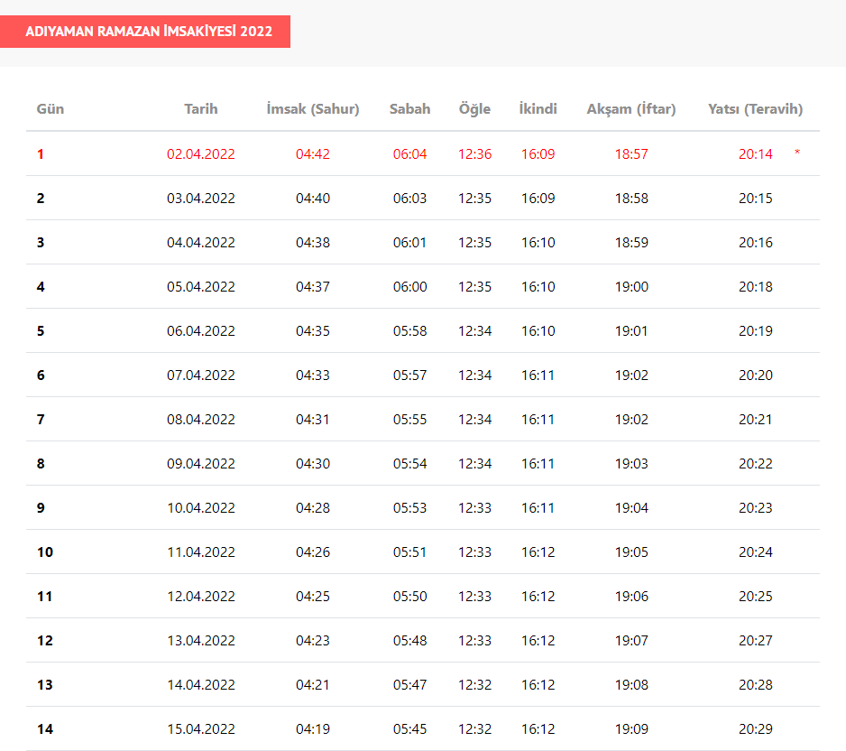 Adıyaman'da ilk iftar, 2 Nisan'da saat 18:57 sahur ise 04:42'de gerçekleşecek.