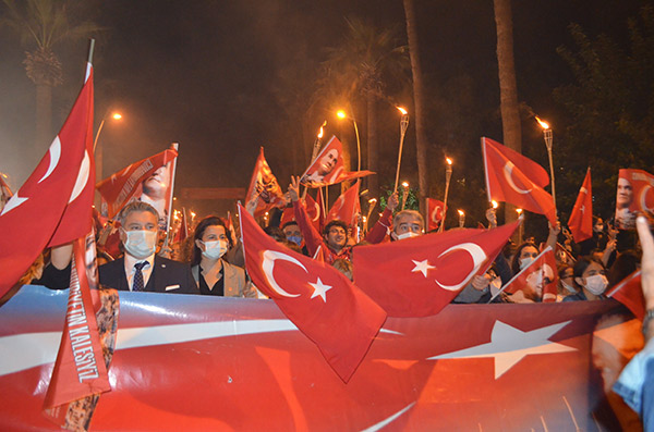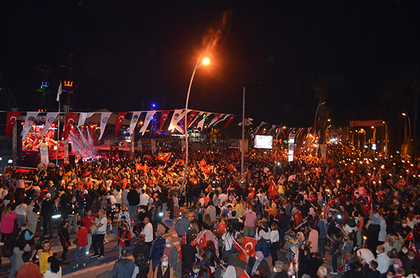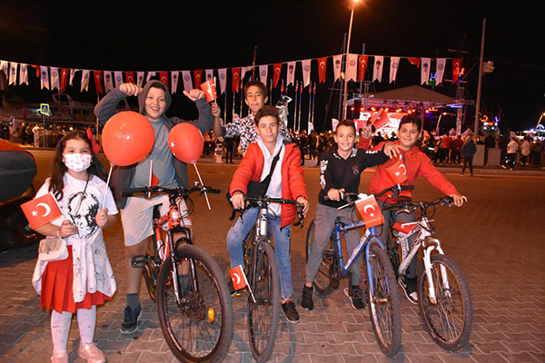 Muğla’nın Marmaris İlçesi’nde, 29 Ekim Cumhuriyet Bayramı kutlama etkinlikleri kapsamında düzenlenen fener alayına binlerce kişi katıldı. 4 kilometrelik fener alayına katılan vatandaşlar, marşlar ve sloganlar eşliğinde ellerinde Türk bayrakları ile yürürken, Halk Müziği sanatçısı Onur Akın konseri ile unutulmaz bir akşam yaşadılar.