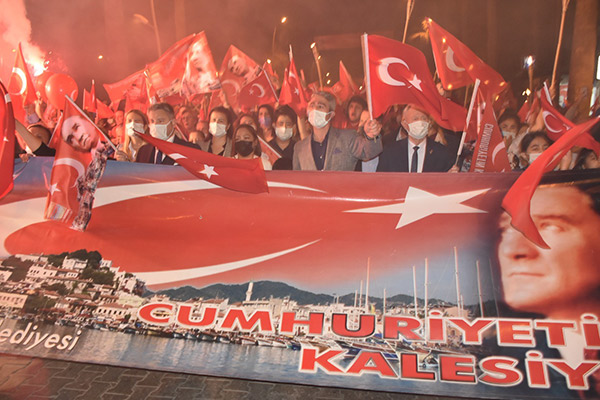 Marmaris Belediyesi'nin düzenlediği fener alayı saat 20.00 da Ketenci Kavşağı’ndan başlayarak Atatürk Meydanı'nda son buldu. Belediye Başkanı Mehmet Oktay ve yardımcıları ellerinde 'cumhuriyetin kalesiyiz' yazılı dövizle ile vatandaşlar ile birlikte yürüdü. Motosikletli ve bisikletli grupların öncülük ettiği yaklaşık 10 bin kişi, 1 kilometre uzunluğunda dev Türk bayrağı taşıdı.