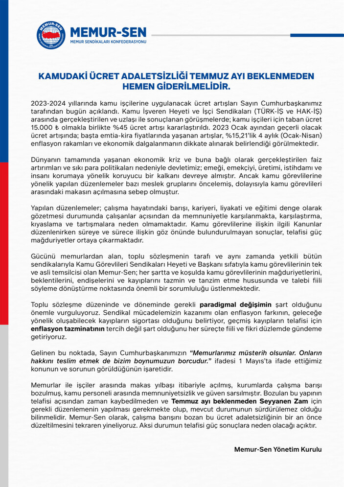 Memurlar ile işçiler arasında makas yılbaşı itibarıyla açılmış, kurumlarda çalışma barışı bozulmuş, bozulan bu yapının telafisi açısından zaman kaybedilmeden ve temmuz ayı beklenmeden seyyanen zam için gerekli düzenlemenin yapılması gerekmekte olup, mevcut durumunun sürdürülemez olduğu bilinmelidir. Memur-Sen olarak çalışma barışını bozan bu ücret adaletsizliğinin bir an önce düzeltilmesini tekraren yineliyoruz. Aksi durumun telafisi güç sonuçlara neden olacağı açıktır.