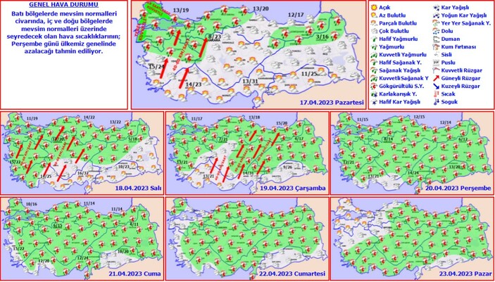 Yetkililer, Doğu’da sıcaklığın 2 ile 4 derece arasında artacağını ancak bunun önemli bir değişikliğe neden olmayacağını belirtiyor. Bayram rüzgarın, genellikle güney yönlerden hafif, ara sıra orta kuvvette eseceği tahmin ediliyor. Marmara, Ege, Akdeniz, İç Anadolu, Batı Karadeniz, Orta ve Doğu Karadeniz’de havanın parçalı ve çok bulutlu, yerel olmak üzere sağanak ve yer yer gök gürültülü sağanak yağışlı geçeceği tahmin ediliyor. Bu arada Meteoroloji, Doğu Karadeniz'in iç kesimlerinin yüksek kar örtüsüne sahip eğimli yamaçlarında çığ tehlikesi karşı da uyardı.