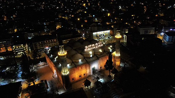 İslamiyet'in en büyük mabetleri arasında sayılan 622 yıllık Bursa Ulu Cami'ye asılan "Şifa ayı Ramazan" yazılı mahya geceyi aydınlattı.