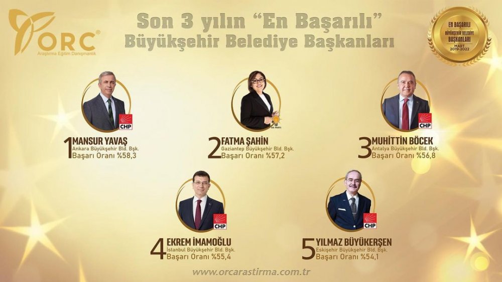 Son 3 yılın en başarılı Büyükşehir Belediye Başkanları ise sırasıyla; CHP Ankara Büyükşehir Belediye Başkanı Mansur Yavaş, Ak Parti Gaziantep Büyükşehir Belediye Başkanı Fatma Şahin, CHP Antalya Büyükşehir Belediye Başkanı Muhittin Böcek, CHP İstanbul Büyükşehir Belediye Başkanı Ekrem İmamoğlu, CHP Eskişehir Büyükşehir Belediye Başkanı Yılmaz Büyükerşen seçildi.