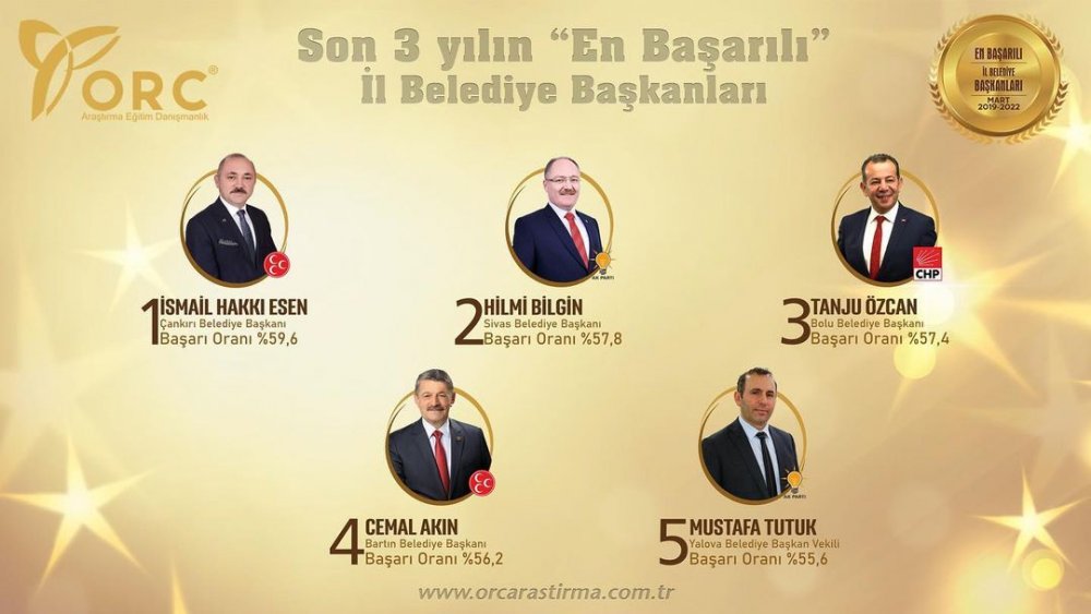 Son 3 yılın en başarılı İl Belediye Başkanları ise sırasıyla; Çankırı Belediye Başkanı İsmail Hakkı Esen, Ak Parti Sivas Belediye Başkanı Hilmi Bilgin, CHP Bolu Belediye Başkanı Tanju Özcan, MHP Bartın Belediye Başkanı Cemal Akın, Ak Parti Yalova Belediye Başkanı Mustafa Tutuk seçildi.
