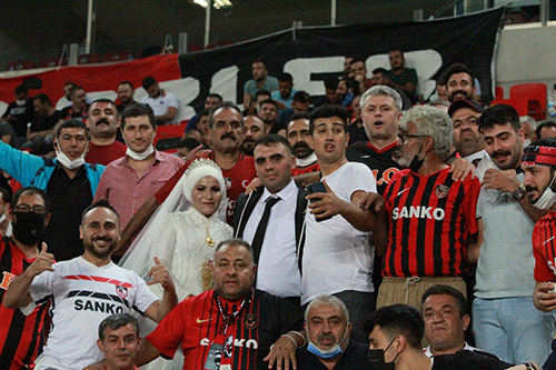 Gaziantep FK ile Antalyaspor'u karşı karşıya getiren Süper Lig 4. hafta karşılaşmasına statta maçı izlemeye gelen gelin damat damga vurdu. Gaziantep FK'yı düğün günü de yalnız bırakmayan ve eşiyle birlikte stada gelen damat Mesut Çamurcu'nun tribün lideri olduğu ortaya çıktı.