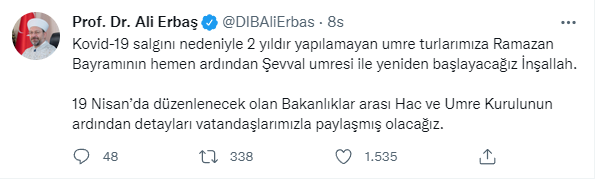 Diyanet İşleri Başkanı Ali Erbaş, Twitter'dan yaptığı açıklamada, "Covid-19 salgını nedeniyle 2 yıldır yapılamayan umre turlarımıza Ramazan Bayramı'nın hemen ardından şevval umresi ile yeniden başlayacağız. 19 Nisan'da düzenlenecek Bakanlıklar Arası Hac ve Umre Kurulunun ardından detayları vatandaşlarımızla paylaşacağız." dedi.