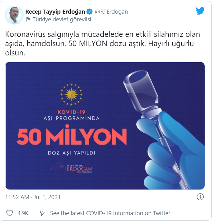 "Koronavirüs salgınıyla mücadelede en etkili silahımız olan aşıda, hamdolsun, 50 MİLYON dozu aştık. Hayırlı uğurlu olsun. Güçlü sağlık sistemimiz, sağlık çalışanlarımızın gayreti ve Milletimizin hassasiyetiyle birlikte yakın zamanda devreye alacağımız yerli aşımız TURKOVAC ile inşallah KOVİD-19’la mücadelemizi çok daha güçlü bir şekilde sürdürecek, Türkiye'yi daha sağlıklı yarınlara taşıyacağız."
