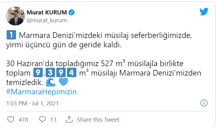 "30 Haziran günü topladığımız 527 metreküp müsilajla birlikte 9 bin 394 metreküp müsilajı Marmara Denizimizden temizledik. 30 Haziran itibarıyla illerimizde, İstanbul 5 bin 11 metreküp, Kocaeli 476 metreküp, Bursa 165 metreküp, Tekirdağ 154 metreküp, Balıkesir 776 metreküp, Çanakkale 882 metreküp, Yalova 1930 metreküp müsilajı 544 bölgedeki çalışmalarımızda toplayarak bertarafa gönderdik."