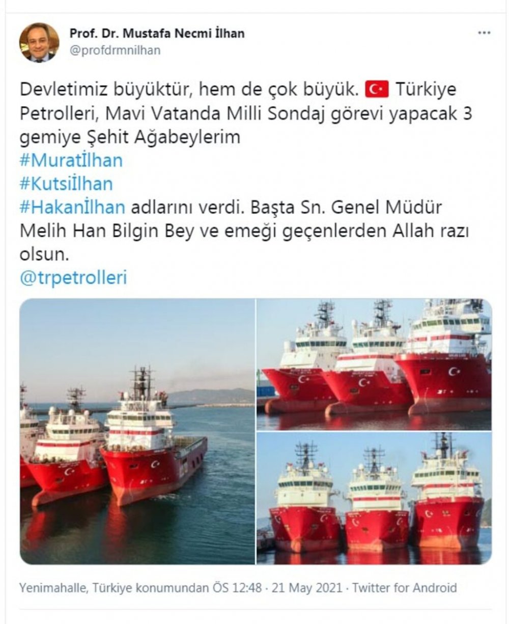 Prof. Dr. Mustafa Necmi İlhan, şehit ağabeylerinin isimlerinin Türkiye Petrolleri tarafından 'Mavi Vatan'da görev yapacak 3 gemiye verildiğini duyurdu. İlhan, "Devletimiz büyüktür, hem de çok büyük. Türkiye Petrolleri, Mavi Vatanda milli sondaj görevi yapacak 3 gemiye şehit ağabeylerim 'Murat İlhan', 'Kutsi İlhan', 'Hakan İlhan' adlarını verdi. Başta Sayın Genel Müdür Melih Han Bilgin Bey ve emeği geçenlerden Allah razı olsun" ifadelerini kullandı.