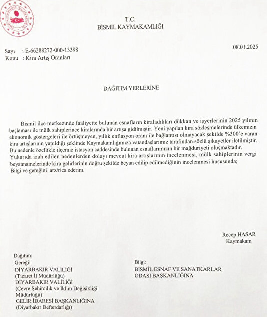 Bismil Kaymakamlığı tarafından gönderilen resmi yazıda, yeni kira sözleşmelerinde yüzde 300’e varan zamların yapıldığı ve bu durumun özellikle İstasyon Caddesi’nde faaliyet gösteren esnafları ciddi şekilde mağdur ettiği belirtildi.