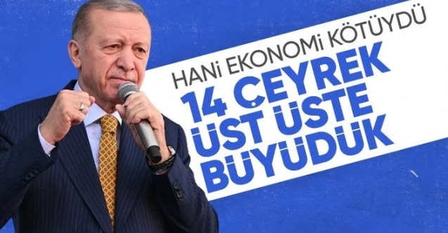 Cumhurbaşkanı Erdoğan, iktidarı ekonomi konusunda eleştirenlere Türkiye'nin 14 çeyrektir büyüme başarısı gösterdiğini hatırlatırken "Ekonomimiz yüzde 4,5 büyüdü. Hani ekonomi kötüydü?" dedi.