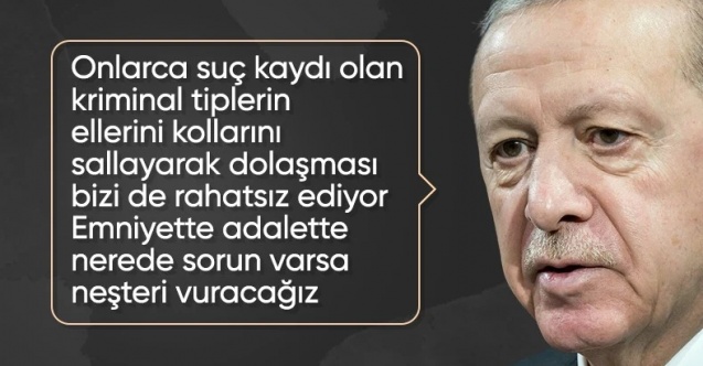 Bazı kriminal tiplerin ortalıkta dolaşmasından kendilerinin de rahatsız olduğunu bildiren Cumhurbaşkanı Erdoğan, "İnsanlarımızın hayatını güvenle hissedebilmesini sağlamak için ne gerekiyorsa yapacağız." şeklinde konuştu.