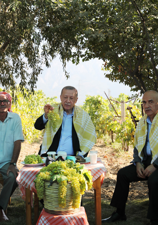 Manisalı çiftçilere toplam 4 milyar lira tutarında tarımsal destek verildiğini vurgulayan Cumhurbaşkanı Erdoğan, şunları söyledi: "Bugün buraya gelmeden önce bir üzüm bağını ziyaret ettim. Bu vesileyle hasat dönemi gelen her ürün gibi bölgemizin en önemli gelir kaynaklarından olan Sultani çekirdeksiz üzümün alım fiyatını da şimdi sizlerle paylaşmak istiyorum. Alım fiyatlarını hasat döneminin başında ilan etmemizin sebebi, üreticimizin emeğinin hakkını alabilmesini sağlamak, herhangi bir istismara meydan vermemektir. Ülkemize yılda 500 milyon dolarlık ihracat geliri kazandıran 9 numaralı Sultani çekirdeksiz kuru üzümü Toprak Mahsulleri Ofisimiz, yani biz çiftçi kardeşlerimizi mağdur ve mahrum etmeyiz. Yani geçen yıl bu 13 liraydı değil mi? Şimdi bu yıl da Cumhurbaşkanınız, bütün arkadaşlarımızla değerlendirmelerimizi yaptık ve fiyat olarak hem güçlü devlet hem güçlü çiftçi olarak fiyatımızı 27 lira olarak belirledik. Nasıl bereketli mi, elhamdülillah yani sizin bu bereketiniz var ya sizin bu samimiyetiniz var ya sizin bu ihlasınız var ya inşallah üzümlerde ki bereketi de ne yapacaktır, artıracaktır. İnşallah şöyle iki gün içerisinde üzümlerimizi toparlayıp, bir hafta içinde de kurutup hemen yola koyulalım ve ihracatımızı da buna göre yapalım. Ya Allah bismillah diyelim. Kuru üzüm fiyatımızın üreticilerimize, ihracatçılarımıza ve ülkemize hayırlı olmasını diliyorum."