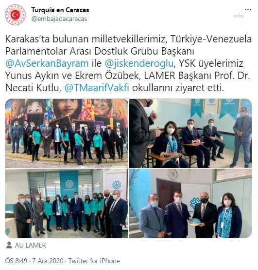 Peker’in iddiaları tartışılırken, AKP İstanbul Milletvekili Serkan Bayram’ın, 7 Aralık 2020 tarihinde yaptığı sosyal medya paylaşımında yer alan bir fotoğrafta, Peker’in açıklamalarında işaret ettiği Erkam Yıldırım’ın da olduğu görüldü. “Türkiye Venezuela Parlamentolar Arası Dostluk Grubu heyetimiz ile birlikte Caracas’ta Türkiye Maarif Vakfı okullarını ziyaret ettik” diyen Bayram’ın mesajı Türkiye’nin Karakas Büyükelçiliği tarafından da paylaşıldı.