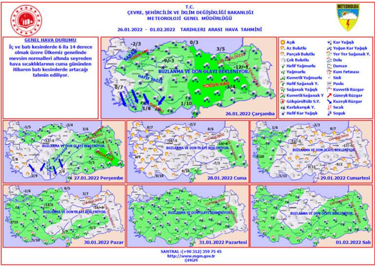 Meteoroloji Genel Müdürlüğü tarafından yapılan son değerlendirmelere göre: ülke genelinin çok bulutlu, Marmara’nın doğusu, İç Ege, Akdeniz, İç Anadolu, Karadeniz, Doğu Anadolu'nun batısı, Güneydoğu Anadolu ile Muğla, Erzurum, Bingöl, Muş, Şırnak ve Bitlis çevrelerinin aralıklı yağışlı geçeceği tahmin ediliyor. Akdeniz kıyılarında yağmur ve karla karışık yağmur, diğer yerlerde kar şeklinde görülecek olan yağışların; İç Anadolu’nun kuzeydoğusu, Orta Karadeniz kıyıları, Doğu Anadolu’nun batısı ile Kocaeli, Yalova, Sakarya’nın kuzeyi, K. Maraş, Osmaniye, Hatay, Anamur, Tokat, Muş, Bingöl, Adıyaman, G. Antep, Kilis, Ş. Urfa'nın kuzey ve batısı ile Batman ve Diyarbakır’ın kuzey kesimlerinde kuvvetli ve yoğun kar şeklinde olacağı tahmin ediliyor. Doğu Karadeniz’in iç kesimlerinin yüksekleri ile Doğu Anadolu’nun dik yamaçlarında çığ tehlikesi bulunmaktadır. Ülkemiz genelinde buzlanma ve don ile birlikte sis ve pus olayı görüleceği tahmin ediliyor.