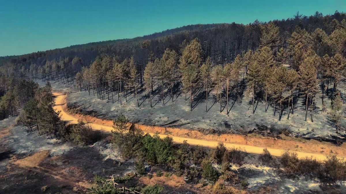 Havadan drone'la çekilen görüntülerde, yangının etkili olduğu bölgelerde yeşil ormanlık alanların yerini siyah kül örtüsünün aldığı görüldü.
