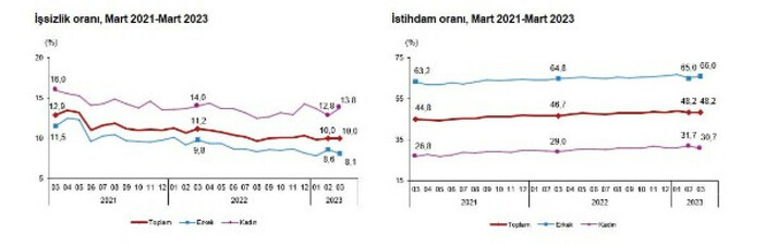 İstihdam edilenlerin sayısı 2023 yılı Mart ayında bir önceki aya göre 37 bin kişi artarak 31 milyon 462 bin kişi, istihdam oranı ise değişim göstermeyerek yüzde 48,2 oldu. Bu oran erkeklerde yüzde 66 iken kadınlarda yüzde 30,7 olarak gerçekleşti.