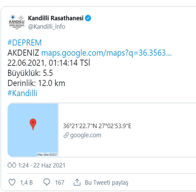 Boğaziçi Üniversitesi Kandilli Rasathanesi sosyal medya hesabı Twitter'dan Datça açıklarında meydana gelen depremin 5.5 büyüklüğünde olduğunu açıkladı.