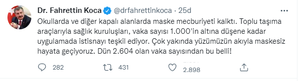 Sağlık Bakanı Fahrettin Koca, "Okullarda ve diğer kapalı alanlarda maske mecburiyeti kalktı. Toplu taşıma araçlarıyla sağlık kuruluşları, vaka sayısı 1.000'in altına düşene kadar uygulamada istisnayı teşkil ediyor. Çok yakında yüzümüzün akıyla maskesiz hayata geçiyoruz. Dün 2 bin 604 olan vaka sayısından bu belli!" dedi.