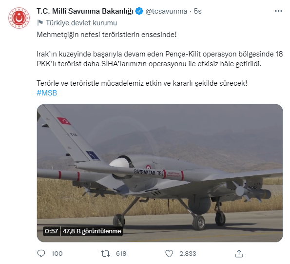 MSB’den yapılan açıklamada, “Mehmetçiğin nefesi teröristlerin ensesinde! Irak'ın kuzeyinde başarıyla devam eden Pençe-Kilit operasyon bölgesinde 18 PKK’lı terörist daha SİHA'larımızın operasyonu ile etkisiz hâle getirildi. Terörle ve teröristle mücadelemiz etkin ve kararlı şekilde sürecek!” denildi.