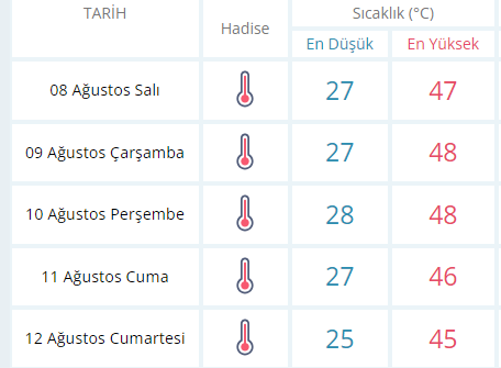 Son 123 yılın en sıcak mevsimi devam ediyor. MGM'nin web sitesinde yayınlanan verilere göre Cizre'de bugün sıcaklık 47 dereceye çıkacak. Ancak 9 ve 10 Ağustos günleri iki gün boyunca tekrar 48 dereceyi bulacak. 11 Ağustos günü 46 dereceye düşerken, 12 Ağustos günü ise 45 dereceye düşecek