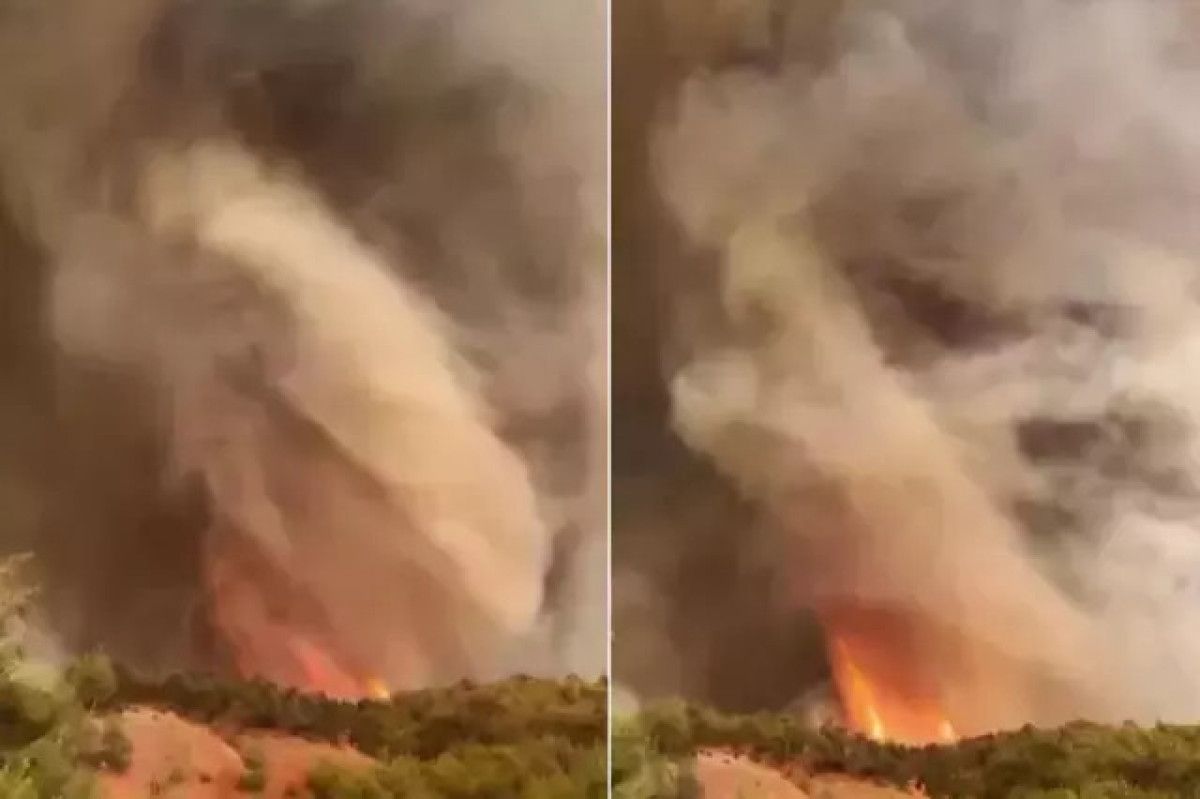 Görüntülerde, alevlerin dönerek gökyüzüne doğru yükseldiği, adeta bir 'yangın hortumu' oluşturduğu anlar yer aldı.