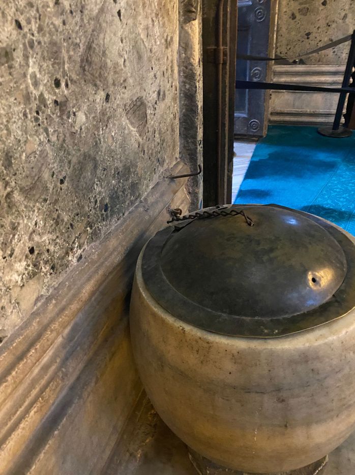 Ayasofya’nın İmparatorluk Kapısı’ndan parçaların koparılmasının ardından bu kez de tarihi yapının içindeki su haznesinin kapağının kırıldığı ve içine ayakkabıların konulduğu görüldü.
