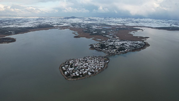 Türkiye'nin Venedik'i olarak bilinen Gölyazı, havadan karlı görüntüsüyle kartpostalları aratmadı. Bursa'nın Nilüfer ilçesinde, Uluabat Gölü kıyısındaki Gölyazı Mahallesi, her mevsimde kendisine hayran bırakmaya devam ediyor. Gölyazı, son iki gündür devam eden kar yağışı ile beyaza büründü. Yaklaşık 2 bin 600 yıl önce hayatın başladığı, nilüfer çiçeği ve balıkçı kadınlarıyla meşhur olan Gölyazı, karla kaplı görüntüsüyle büyük ilgi görüyor.